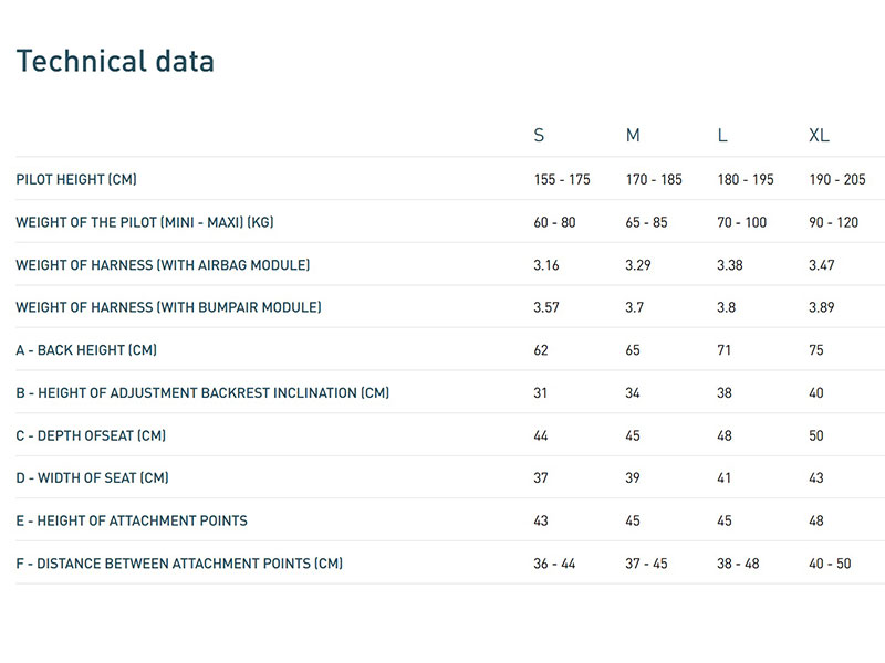Geschikt voor piloten met een lengte van 155 – 205 cm en een gewicht van 60 – 120 kg.